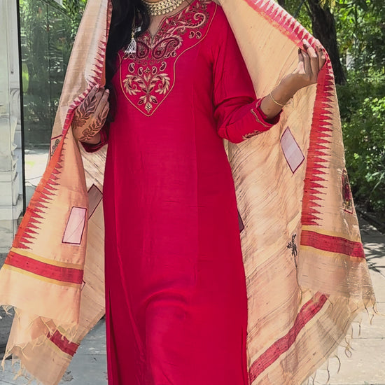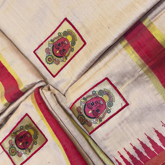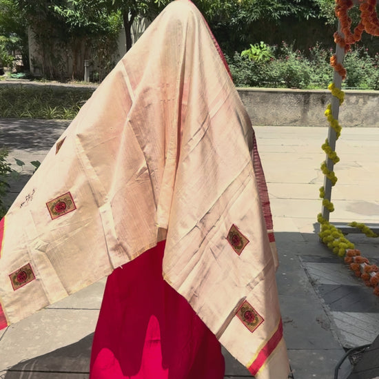 Handwoven in Chhattisgarh, this Beige Silk Dupatta features a Red Temple border for a subtle yet elegant contrast. Made from durable Kosa silk, it's a timeless piece that can last for generations and pairs beautifully with any traditional outfit.
